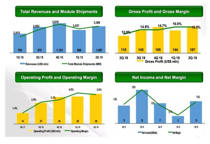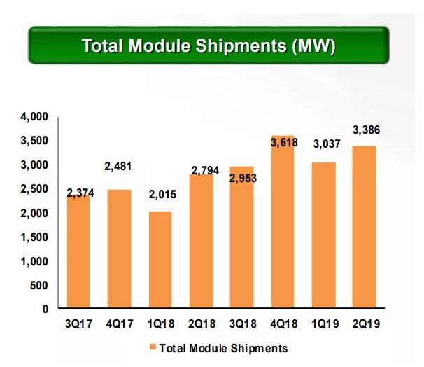 ◎ 太陽(yáng)能組件總出貨量為3,386兆瓦,相比2019年第一季度的3,037兆瓦(包括集團(tuán)內(nèi)部的出貨量)增長(zhǎng)11.5%,相比2018年第二季度的2,794兆瓦增長(zhǎng)21.2%。