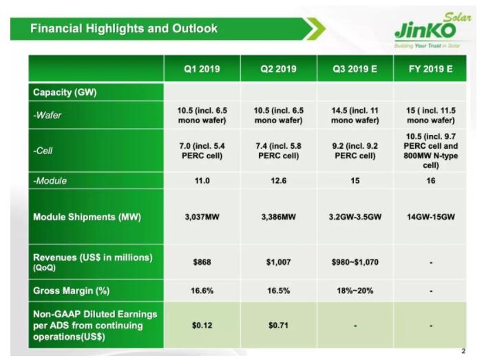 “我們加速高效單晶產(chǎn)能的擴(kuò)張,以滿足增長(zhǎng)中的全球需求。樂(lè)山新項(xiàng)目預(yù)計(jì)年底單晶產(chǎn)能將達(dá)5吉瓦,二期產(chǎn)能擴(kuò)張完成后公司總產(chǎn)能將達(dá)到16.5吉瓦。截至2019年6月30日,公司的硅片、電池片和組件產(chǎn)能分別達(dá)到10.5吉瓦、7.4吉瓦和12.6吉瓦。預(yù)期2019年年底,公司的硅片、電池片和組件產(chǎn)能將分別達(dá)到15吉瓦、10.5吉瓦和16.0吉瓦,其中包括11.5吉瓦的單晶硅片產(chǎn)能,9.7吉瓦的PERC電池產(chǎn)能和800兆瓦的N型電池產(chǎn)能。”